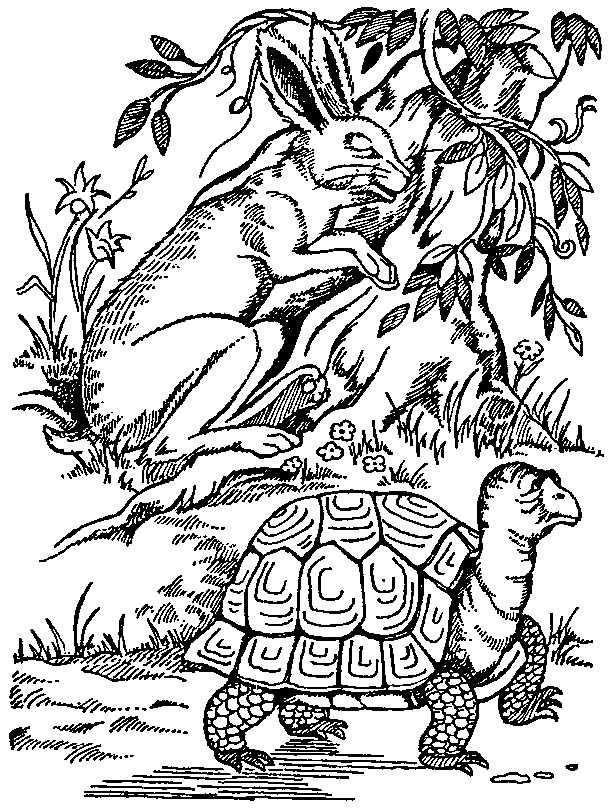 Вот припустил Заяц и сразу оставил Черепаху далеко позади. Но скоро он устал, начал останавливаться, лакомиться по пути сочными листиками. А полуденное солнце припекало с неба, и сделалось Зайцу жарко. Он оглянулся, увидал, что Черепаха плетется где-то далеко-далеко, прилег в тенечке и решил вздремнуть. Черепаху, думает, я всегда обогнать успею. А Черепаха шла себе, шла, видит: Заяц лежит и спит, прошла мимо, а потом вперед.