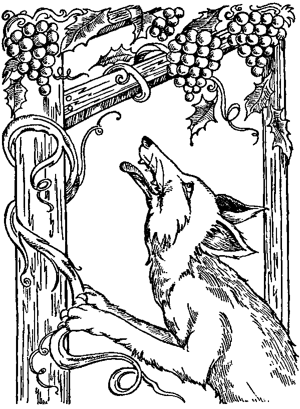 Голодная Лиса как-то увидела: висят на лозах грозди винограда. И стала она прыгать, чтобы виноград достать.