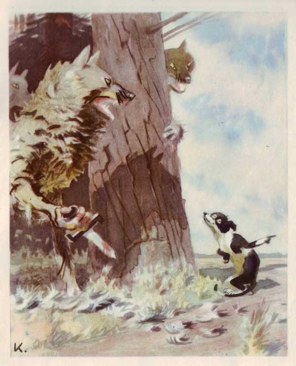 Косого по лесу гоняя,Собаки — Шавка и Полкан —Попали прямо в пасть к волкам, —Им повстречалась волчья стая.От страха Шавка вся дрожит:«Полкаша… Некуда деваться…Я чую смерть свою… Что будем делать?..» —«Драться! —Полкан в ответ ей говорит. —Я на себя возьму того, что покрупнее,А ты бери того, что рядом с ним».И, до врага достав прыжком одним,Вцепился храбрый пёс зубами в волчью шеюИ наземь Серого свалил, —Но тут же сам растерзан был.Что думать Шавке? Очередь за нею!Тут Шавка взвизгнула и в ноги — бух! — волкам:«Голубчики мои! Не погубите!Сродни ведь прихожусь я вам!Вы на уши мои, на хвост мой посмотрите!А чем не волчья шерсть на мне?Сбылась мечта моя — попала я к родне!Пошли за мной, я показать вам рада,Где у реки пасётся стадо…»Вот волки двинулись за Шавкою гуськом,Вначале лесом, после бережком,Под стадо вышли, на хвосты присели,Посовещалися на волчьем языке.И от коров невдалекеНа всякий случай раньше Шавку съели.Но сами тож не уцелели —В жестокой схватке полегли:Сторожевые псы то стадо стереглиИ ружья пастухи имели…