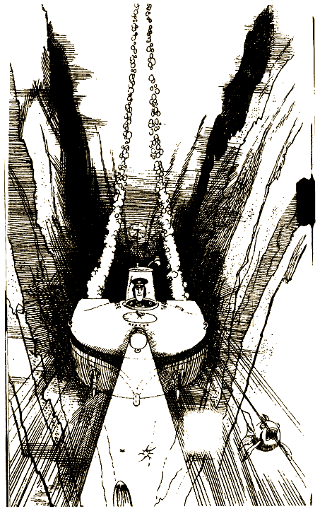 Ты направляешь «Искатель» в грот. Прожектор сразу же высвечивает какие-то проходы и проемы в стенах грота. Прожектор «Искателя» недостаточно мощный. Но у тебя есть еще специальный лазерный прожектор, который мог бы осветить грот как днем. К сожалению, пользоваться им можно только два раза, и то очень недолго, после чего его необходимо перезарядить на борту «Мэрей», которое теперь в двух тысячах футов над тобой.